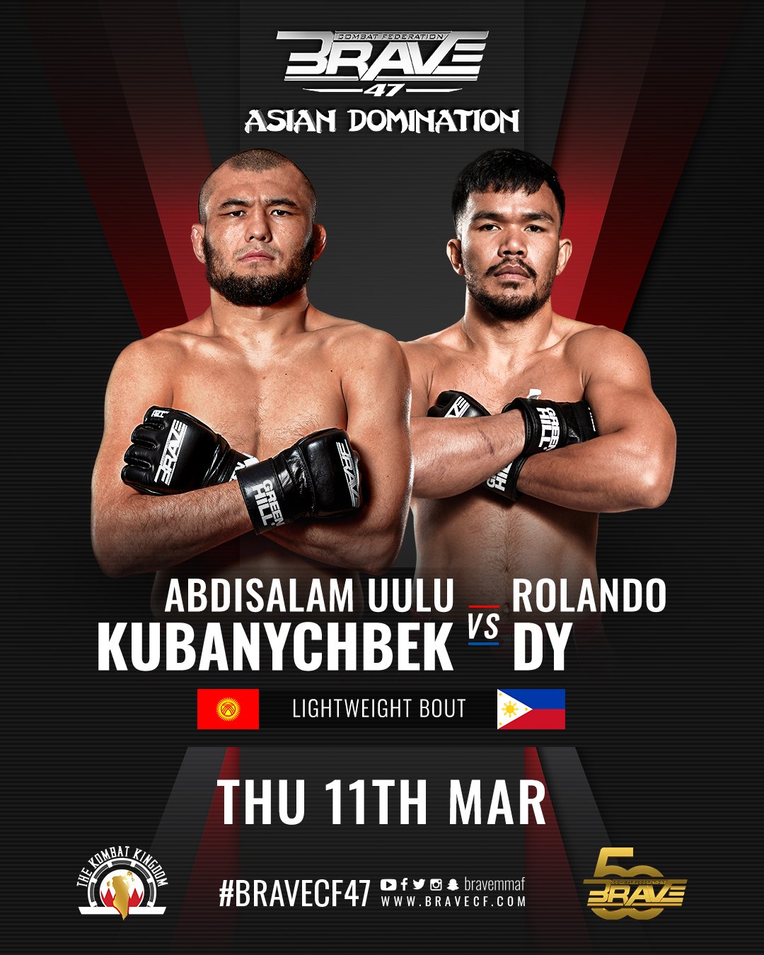 It has been announced that there will be a Lightweight Title Eliminator clash between Kyrgyzstan’s Abdisalam Kubanychbek and the Philippines’ Rolando Dy, serving as the main event for BRAVE CF 47 on March 11.