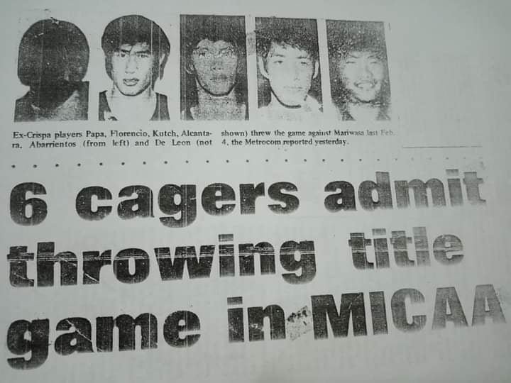 The six players, namely, two-time Olympians (1968 Mexico/1972 Munich) Danilo Florencio and Adriano Papa Jr., and 1969 ABC veteran Rudolf Kutch, Reynaldo Alcantara, Virgilio Abarrientos and Ernesto De Leon – all of whom saw action for venerable Crispa coach Virgilio (Baby) Dalupan during their University of the East days – admitted to throwing Game One of the best-of-three MICAA All-Filipino finals between Crispa and Mariwasa in 1973 in exchange for a fee of P3,000 each. Undoubtedly, it was a huge amount during the time.