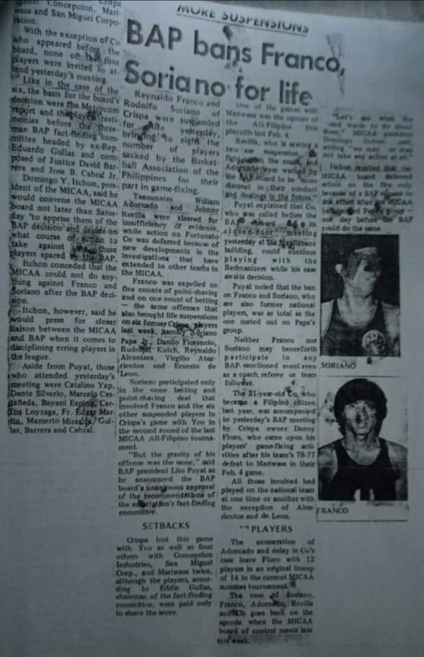 Six players from the country’s top commercial team at the time, Crispa-Floro, were banned for life by the Basketball Association of the Philippines (BAP), then recognized by the International Basketball Federation (FIBA) as the country’s national basketball federation, for their shady activities in the games they played in.