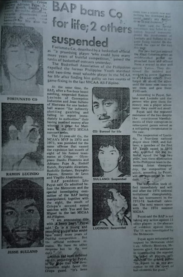 Co’s case was initially held in abeyance after new developments cropped up. By September 1, however, the former two-time NCAA MVP (1970 and 1971) from Mapua Tech, who had acquired Filipino citizenship through naturalization the year before to become eligible to play for the Philippine team to the 1972 Asian Youth Basketball championship held in Manila, became the ninth Crispa player to be banned for life by the BAP after being found guilty of game-fixing in two instances in the 1973 MICAA All-Filipino series.