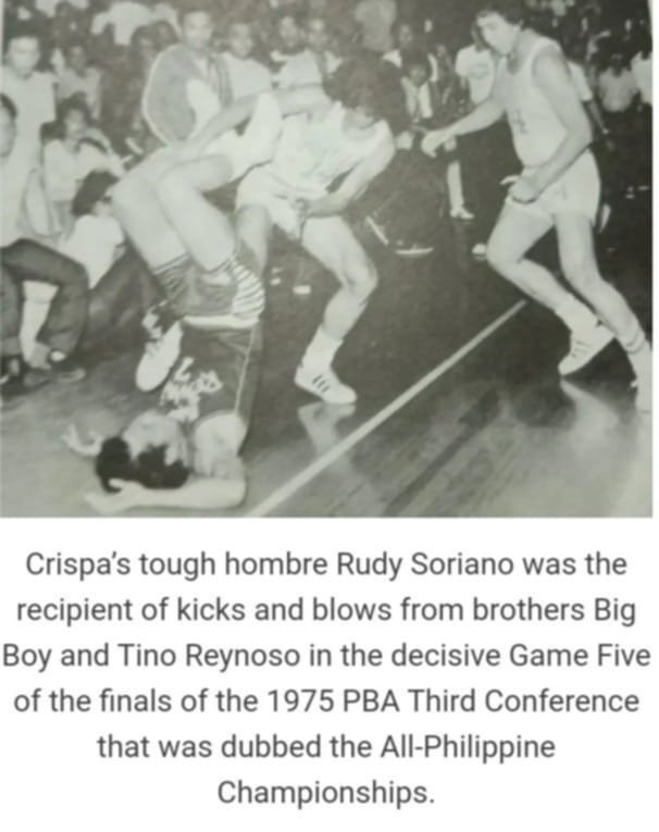 Violence again reared its ugly head near the end of the game, when Crispa’s Philip Cezar took a swing at Ramon Fernandez. For a second time, the contest was stopped for several minutes. A fallen Soriano also was the victim of the raging fists of brothers Alberto (Big Boy) and Cristino (Tino) Reynoso.
