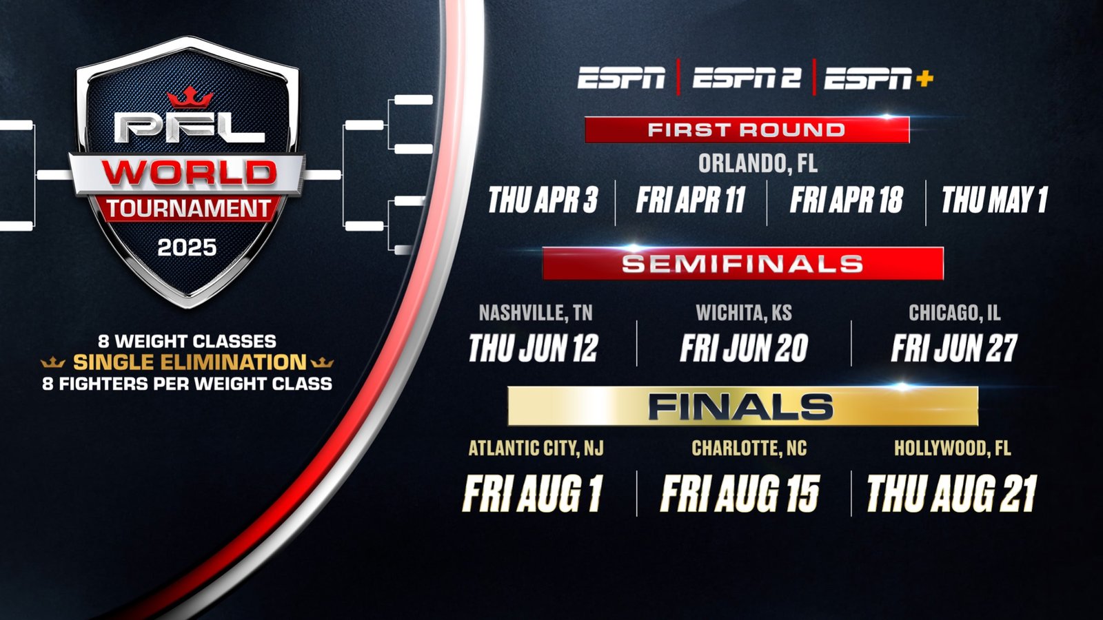 The single-elimination format of the 2025 PFL World Tournament spans five months and includes eight weight classes: Heavyweight, Light Heavyweight, Middleweight, Welterweight, Lightweight, Featherweight, Bantamweight, and Women’s Flyweight. A total of 64 fighters will compete in a gauntlet of three fights for a chance to become champion and win the sport’s toughest prize.