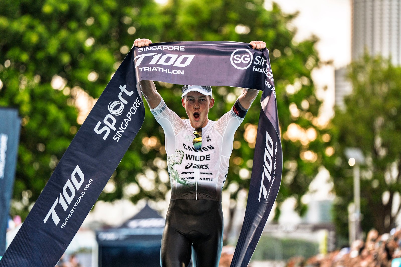 Hayden Wilde celebrates as he crosses the Singapore T100 finish line.