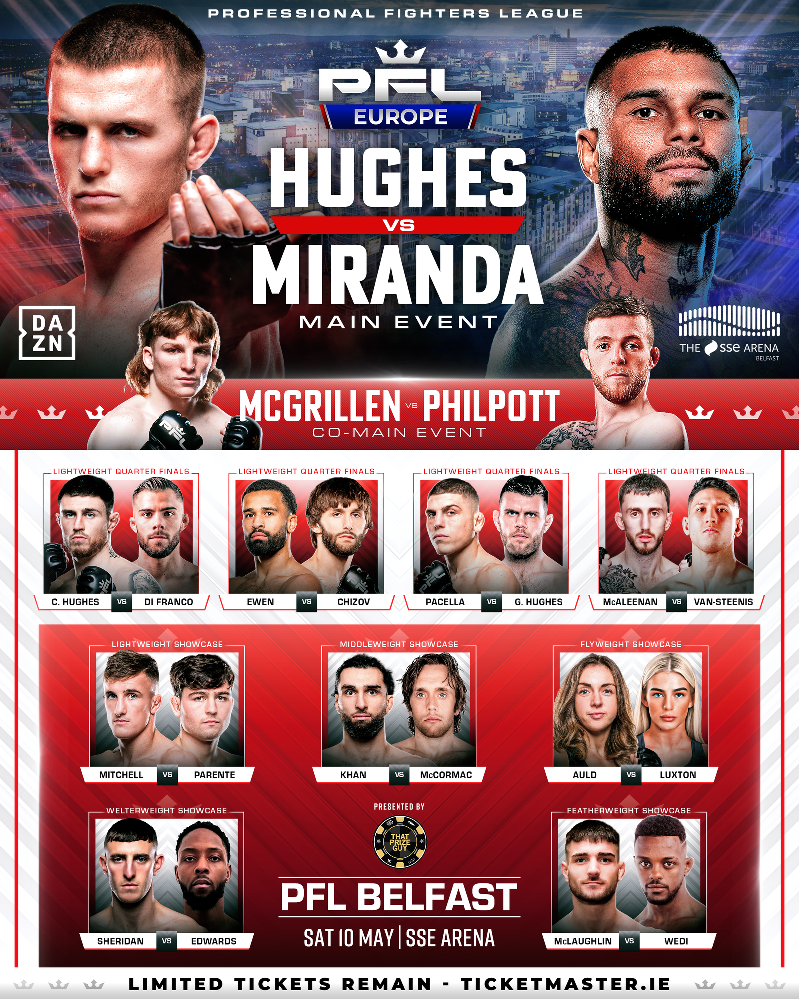 The Professional Fighters League (PFL) has unveiled the complete lineup for PFL Europe Belfast, happening on May 10 at The SSE Arena. The spotlight is firmly on hometown hero Paul “Big News” Hughes (13-2), who headlines the event in a Showcase Main Event Lightweight bout against Brazil’s Bruno “Robusto” Miranda (17-5).