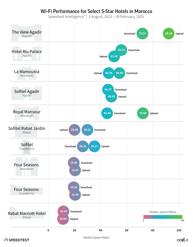 While some cities boast superior fixed broadband, Morocco’s tourist hotspots—Agadir and Marrakesh—are punching above their weight in hotel Wi-Fi performance. Top-tier establishments like The View (72.27 Mbps), Hotel Riu Palace Tikida (55.72 Mbps), and La Mamounia (54.64 Mbps) are setting benchmarks that rival or outperform hotels in cities with faster household internet.