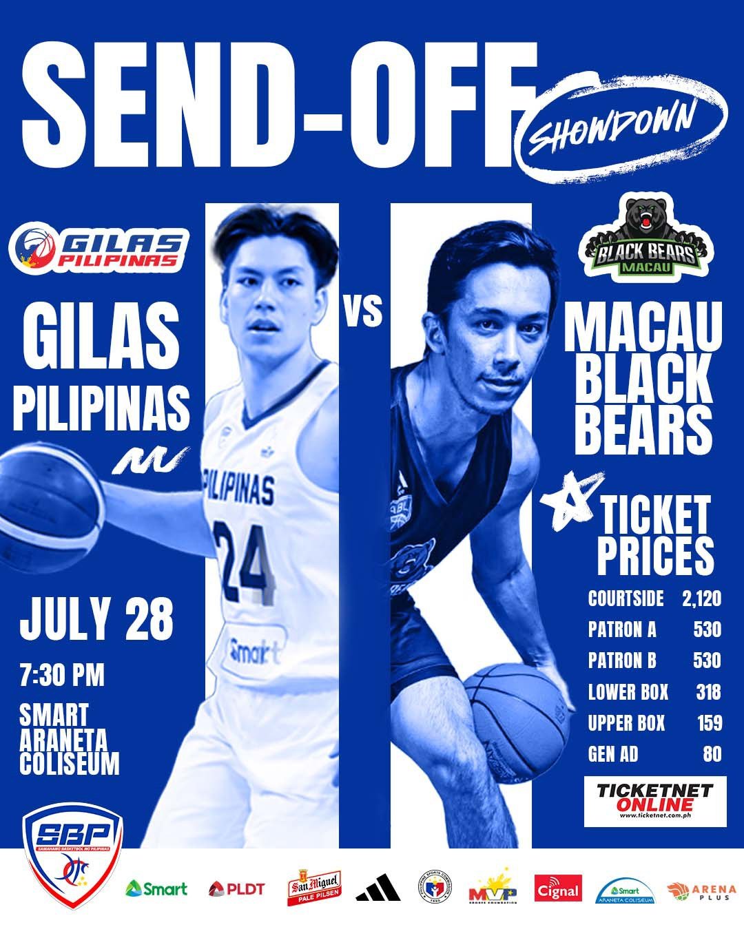 Support Gilas Pilipinas as they go up against the Macau Black Bears on July 28 at the Smart-Araneta Coliseum. This send-off game is your chance to see the team in action before they head to Saudi Arabia.