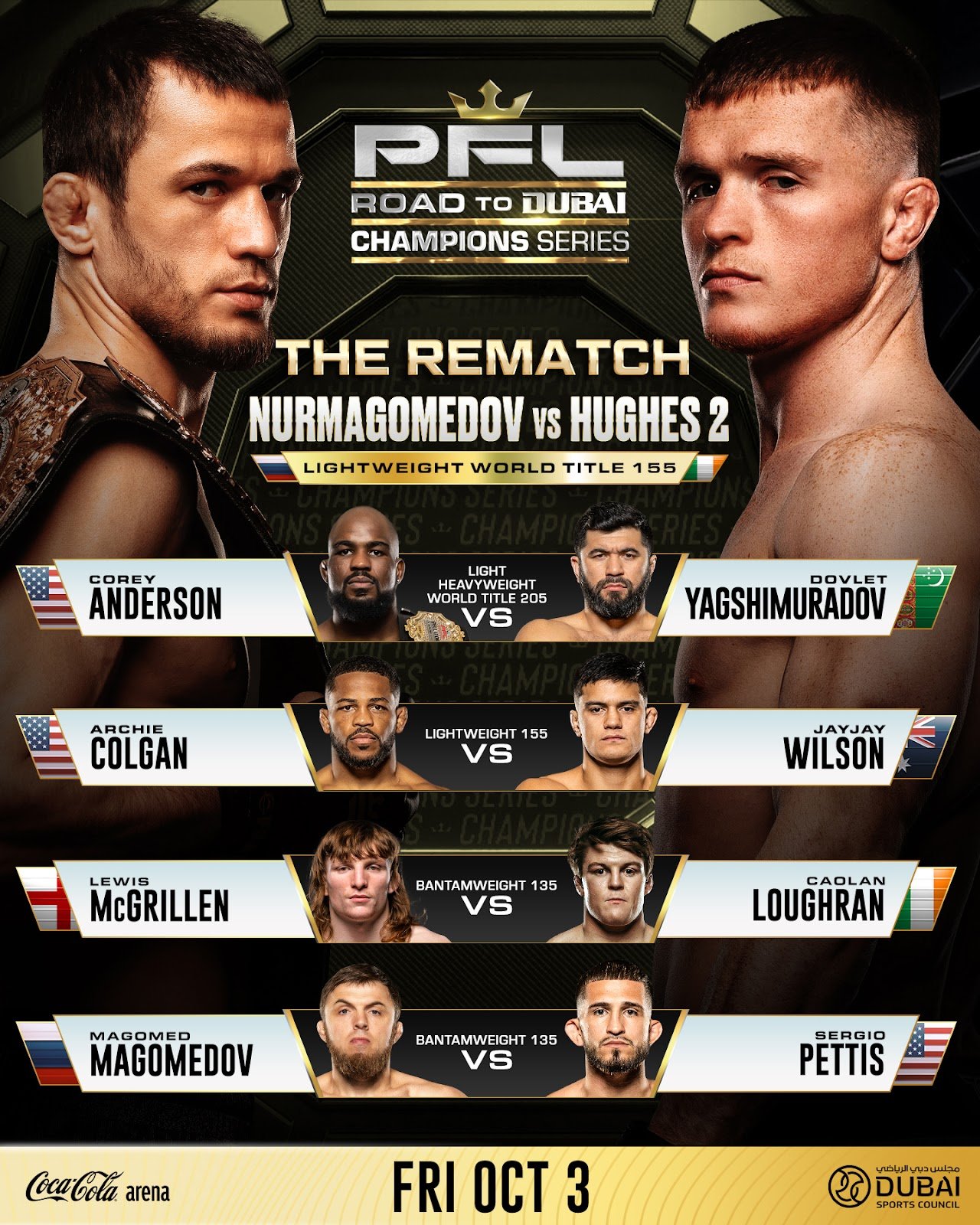 Headlining the card, undefeated lightweight king Usman Nurmagomedov (19-0, 1 NC) meets Ireland’s Paul Hughes (14-2) in a long-awaited rematch for the PFL Lightweight World Title. The co-main event features former Bellator Light Heavyweight Champion Corey Anderson (19-6) against reigning PFL Light Heavyweight World Champion Dovlet Yagshimuradov (25-7-1).