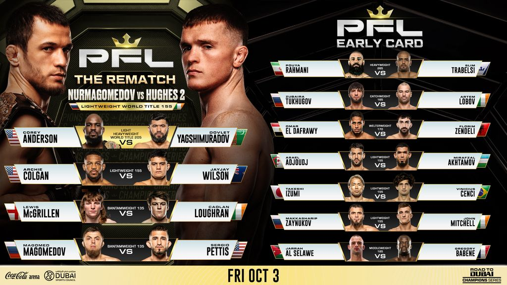 The Professional Fighters League (PFL) has officially completed the lineup for PFL Champions Series: Road to Dubai – The Rematch, set for Friday, October 3, live at Coca-Cola Arena in Dubai.