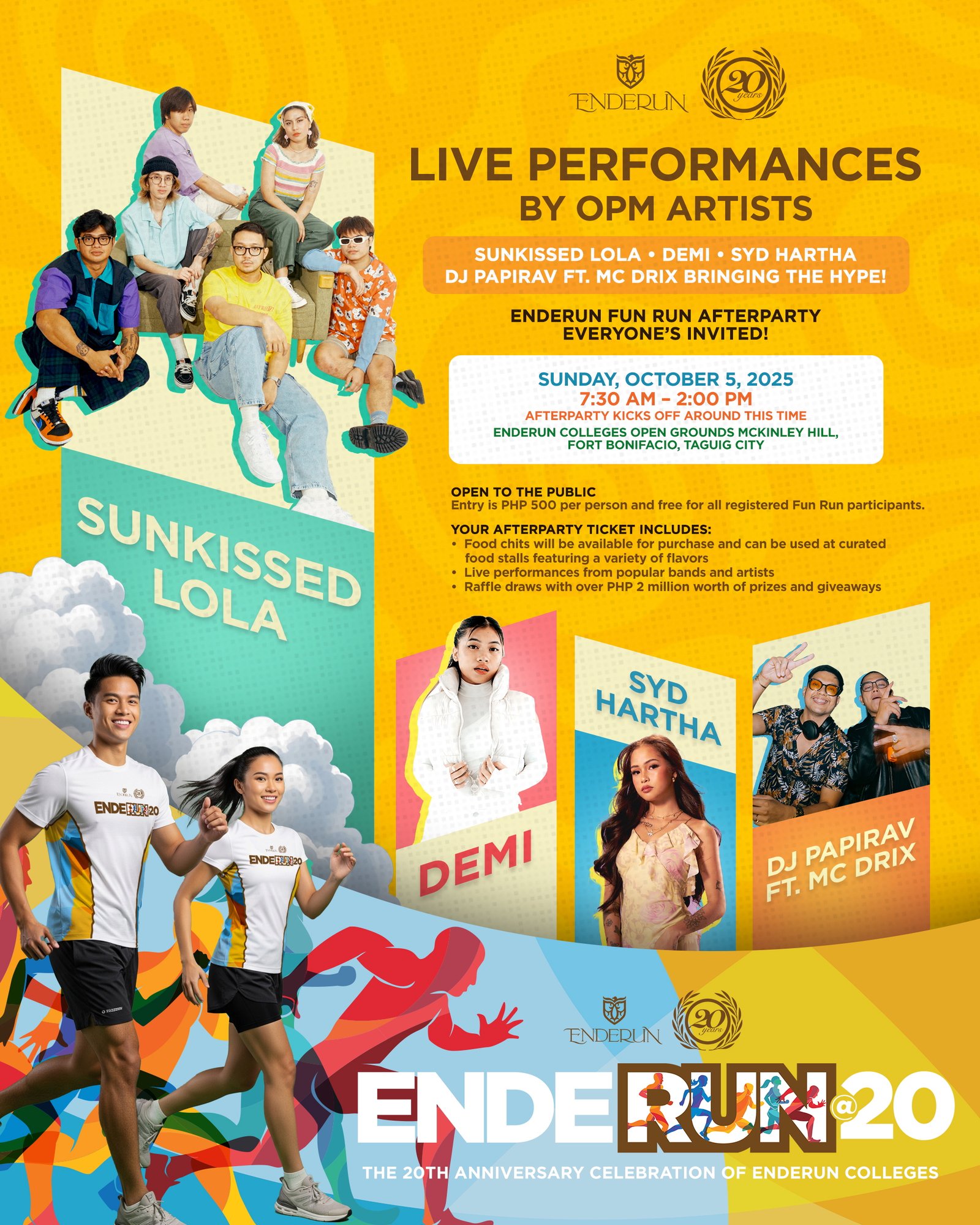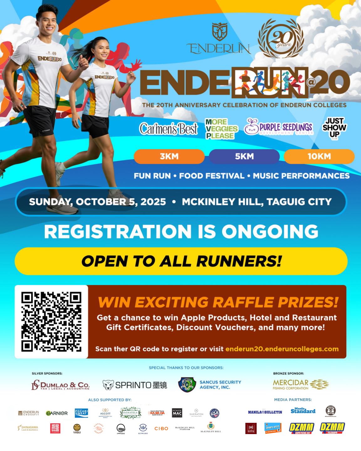 In celebration of its 20th anniversary, Enderun Colleges is hosting a fun run and community festival on Sunday, October 5, 2025, at McKinley Hill, Taguig City. The event is open to everyone, with race categories of 3KM, 5KM, and 10KM. Participants can run through the scenic streets of McKinley Hill before crossing the finish line into a celebration of food, music, and community.
