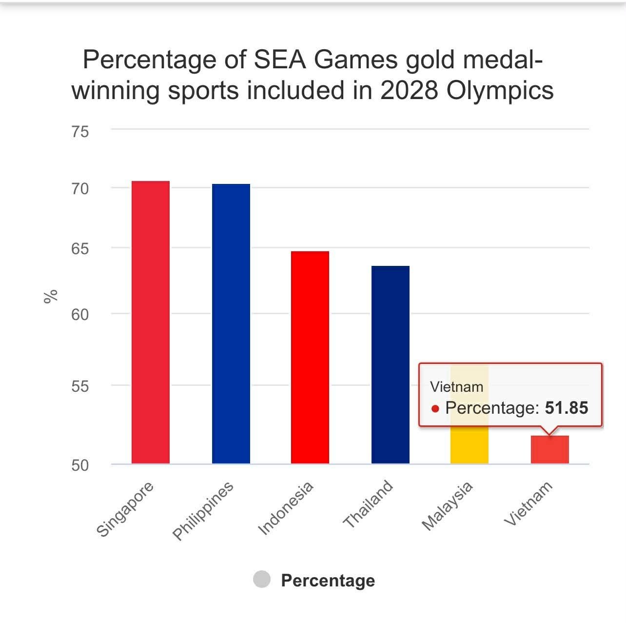 By percentage of Olympic-sport golds, Indonesia followed the Philippines and Singapore at just under 65 percent. Thailand ranked next at 64 percent, ahead of Malaysia at 57 percent and Vietnam at 51.85 percent.