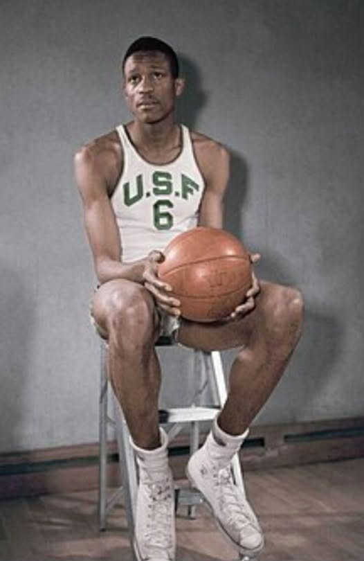 Russell, as if you don’t know, was a dominant force for the University of San Francisco during the Dons’ consecutive NCAA title finishes in 1954–55 and 1955–56. The defensive-minded 6-foot-10 center capped his sterling three-year collegiate career (freshmen were not allowed to suit up for the varsity until the 1972–73 season) with a national College Player of the Year award and a 55-game winning streak by the Jesuit-run program.